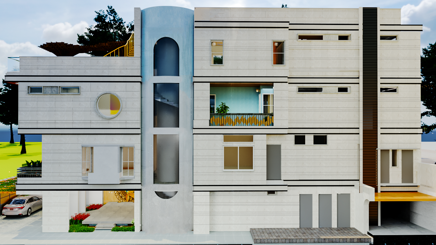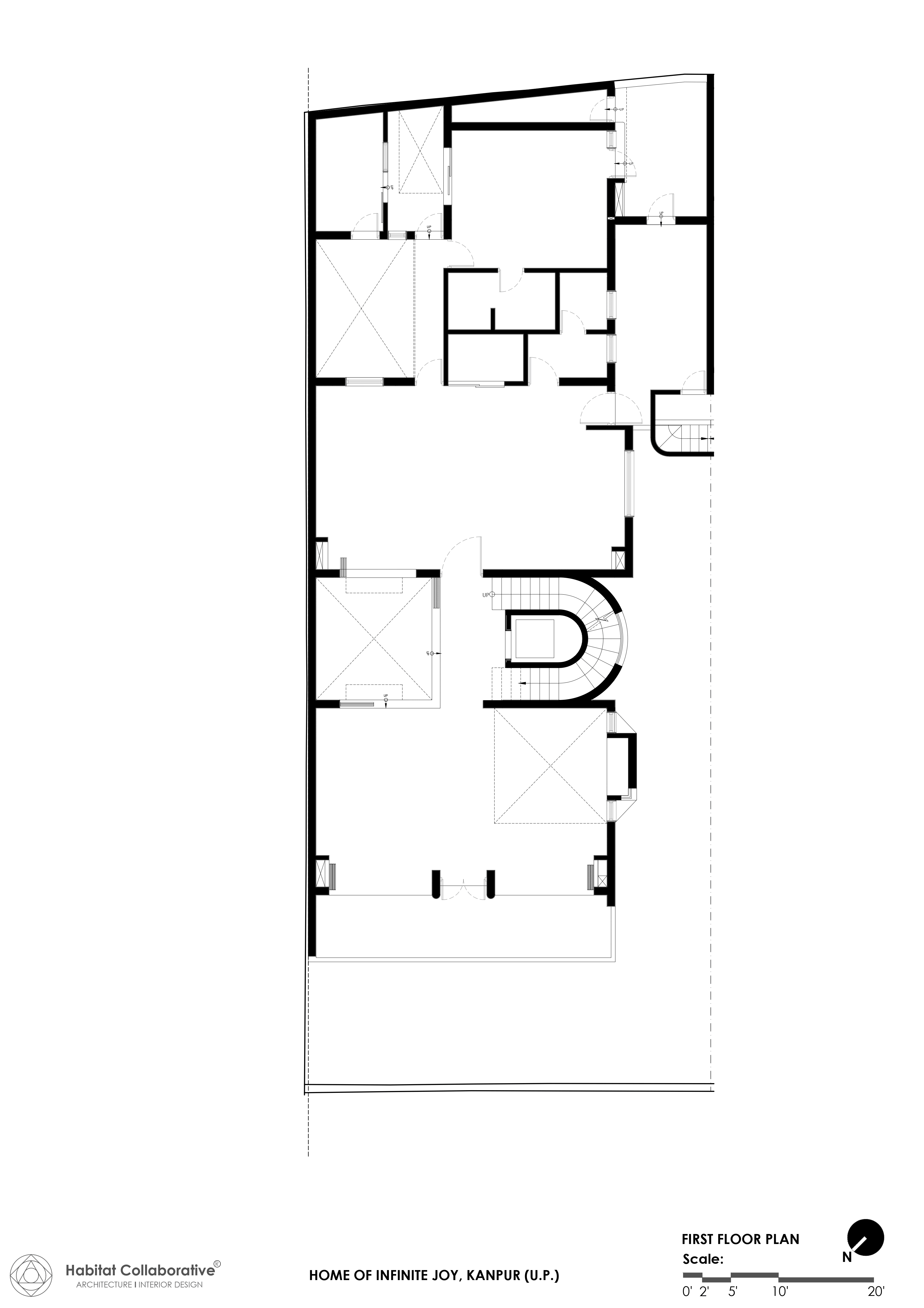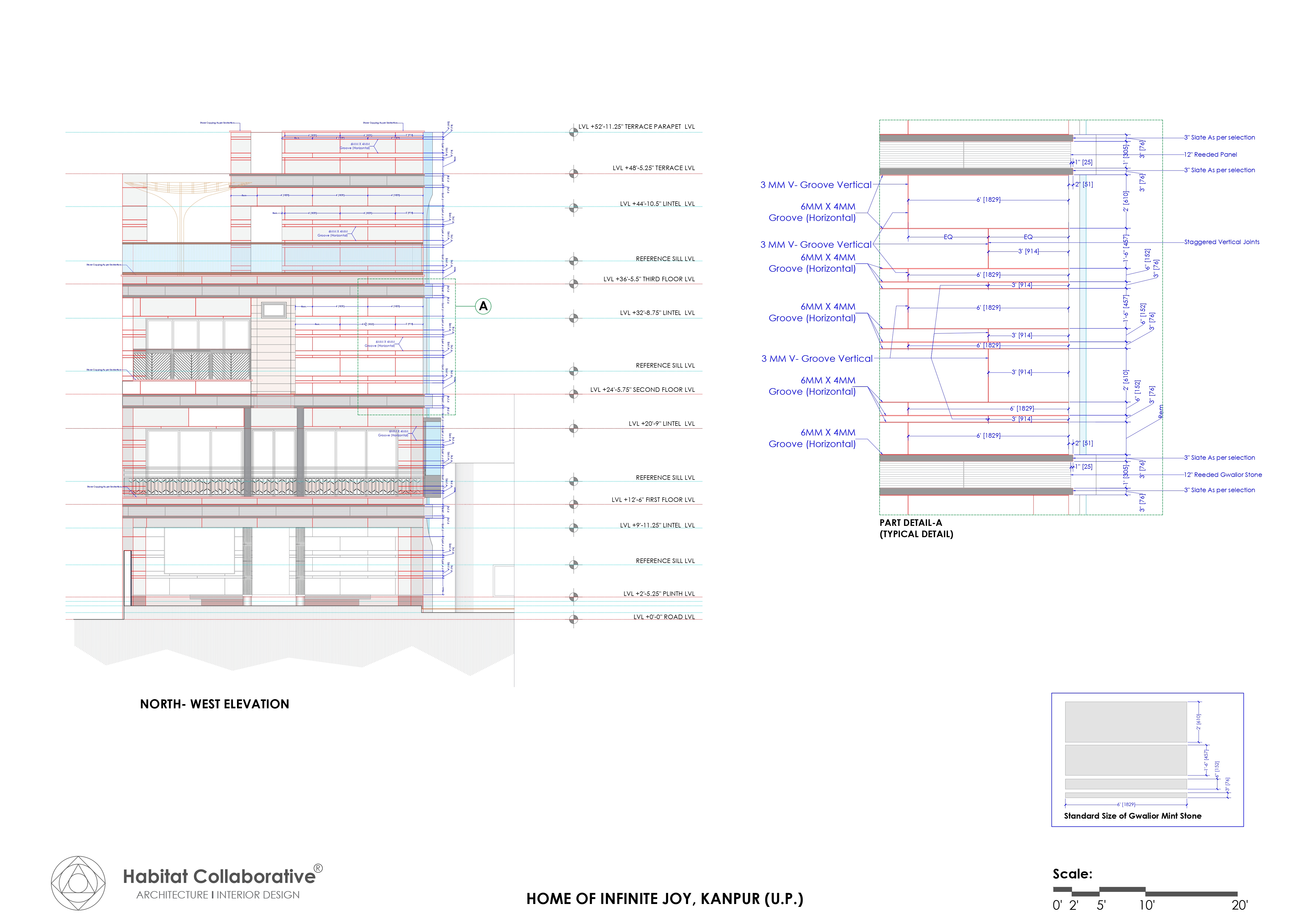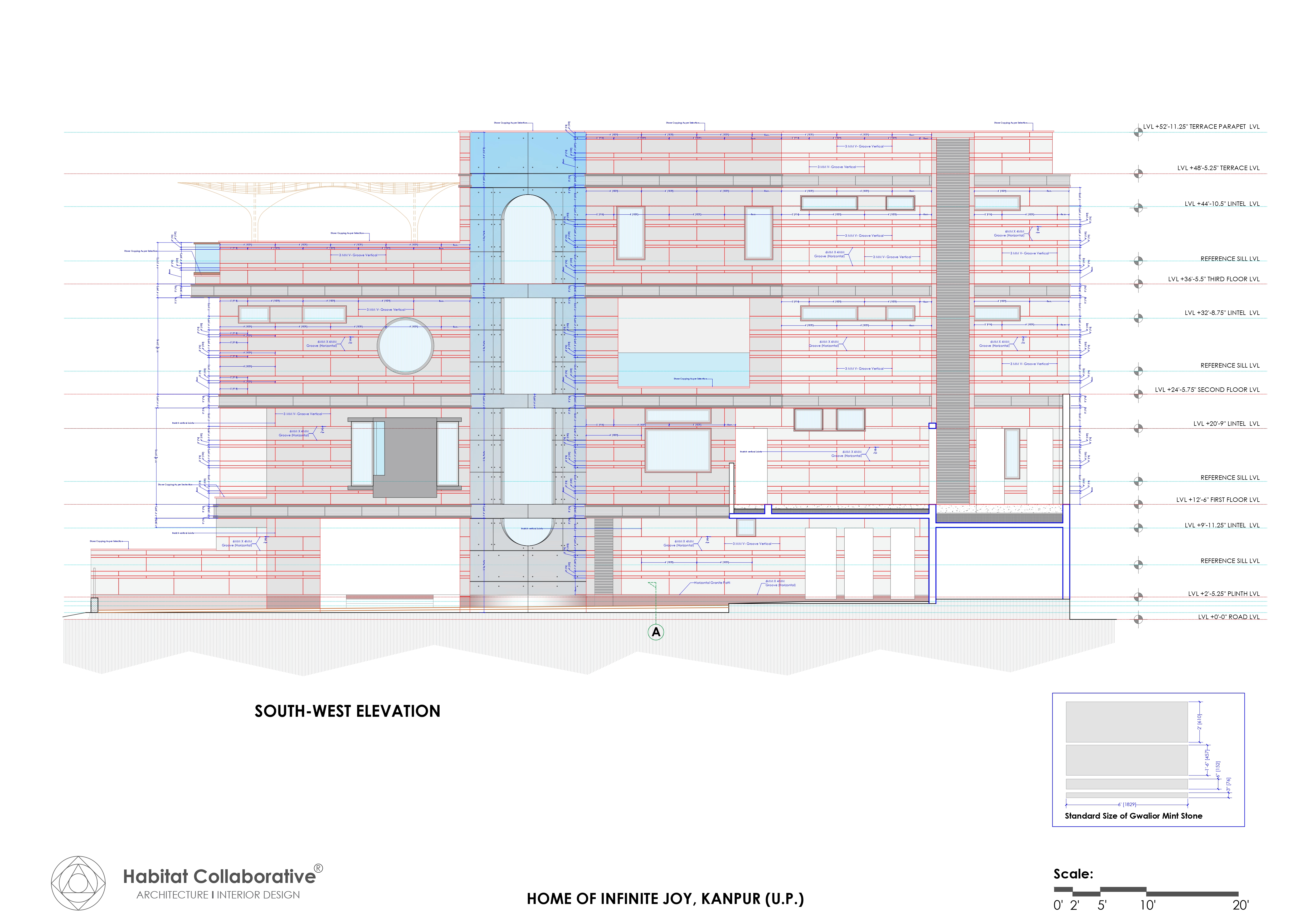 This four storeyed residence is a case study in passive cooling and sustainable design. Despite a zero-lot-line constraint to the north-east, the home maintains a minimal reliance on mechanical cooling through strategic cross-ventilation facilitated by the central courtyard. A dry-clad sandstone skin creates a 50 mm thermal buffer against the exterior walls, drastically reducing heat gain during Kanpur’s extreme summers. Every window is a deliberate aperture, informed by detailed lux studies to modulate light quality and frame specific views.