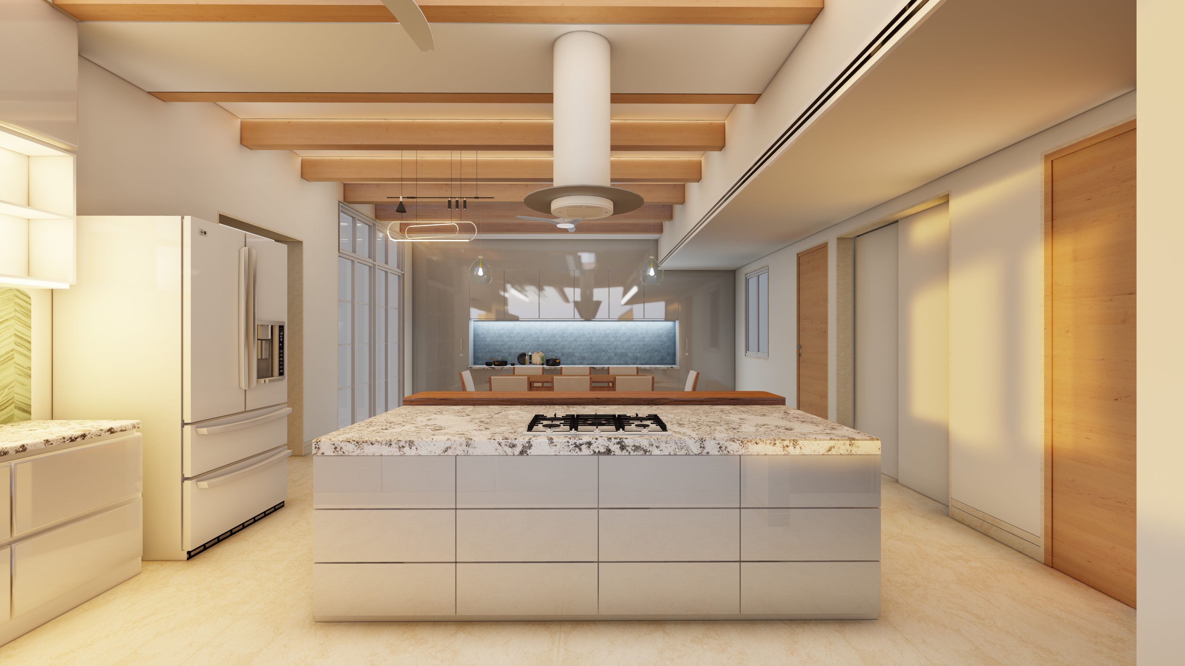 The central Courtyard, acts as both an anchor and a graceful transition between the public and semi-public spaces of the home. With 30 foot wide sliding glass doors towards the north-western balcony verandah, the living room is designed to create an experientially rich ambience with a variety of seating options and play in volumes. From warm earthy tones of the limewashed walls and polished marble flooring to the raw, uninhibited beauty of natural teak wood and Indian granite, this space invigorates a sense a calm balanced with just the right amount of rawness to create a sophisticated living experience.