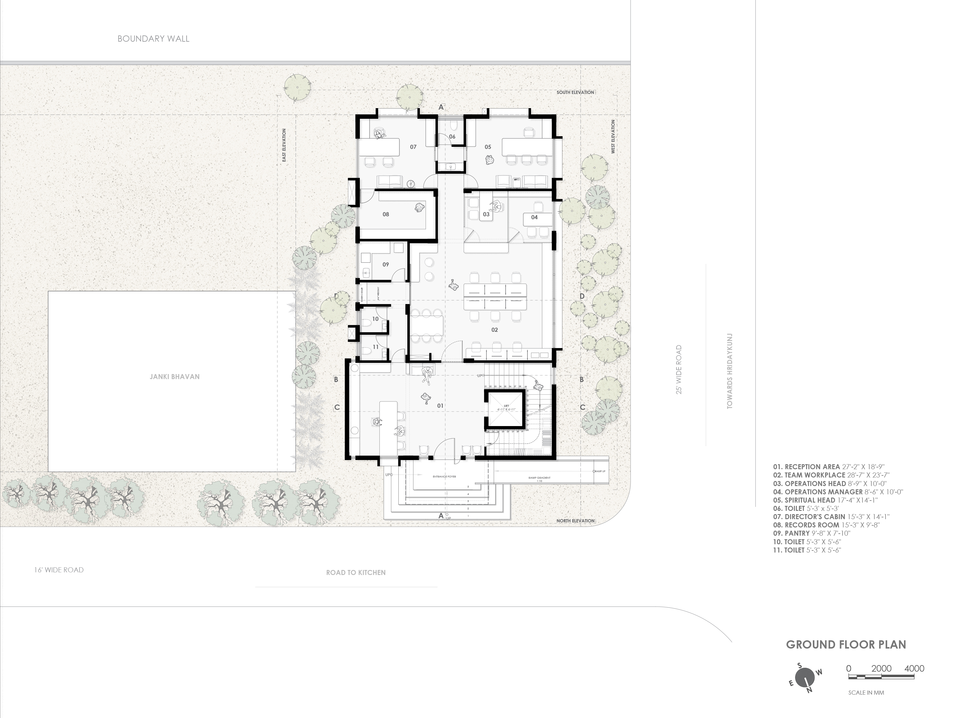 The building is designed to feel outward-looking and welcoming. The use of warm wooden doors and large glass panel windows ensures that while the building is structurally “heavy” while remaining visually transparent and welcoming. The flow of spaces further enhances this fluidity with an open plan office designed to create a collaborative environment.