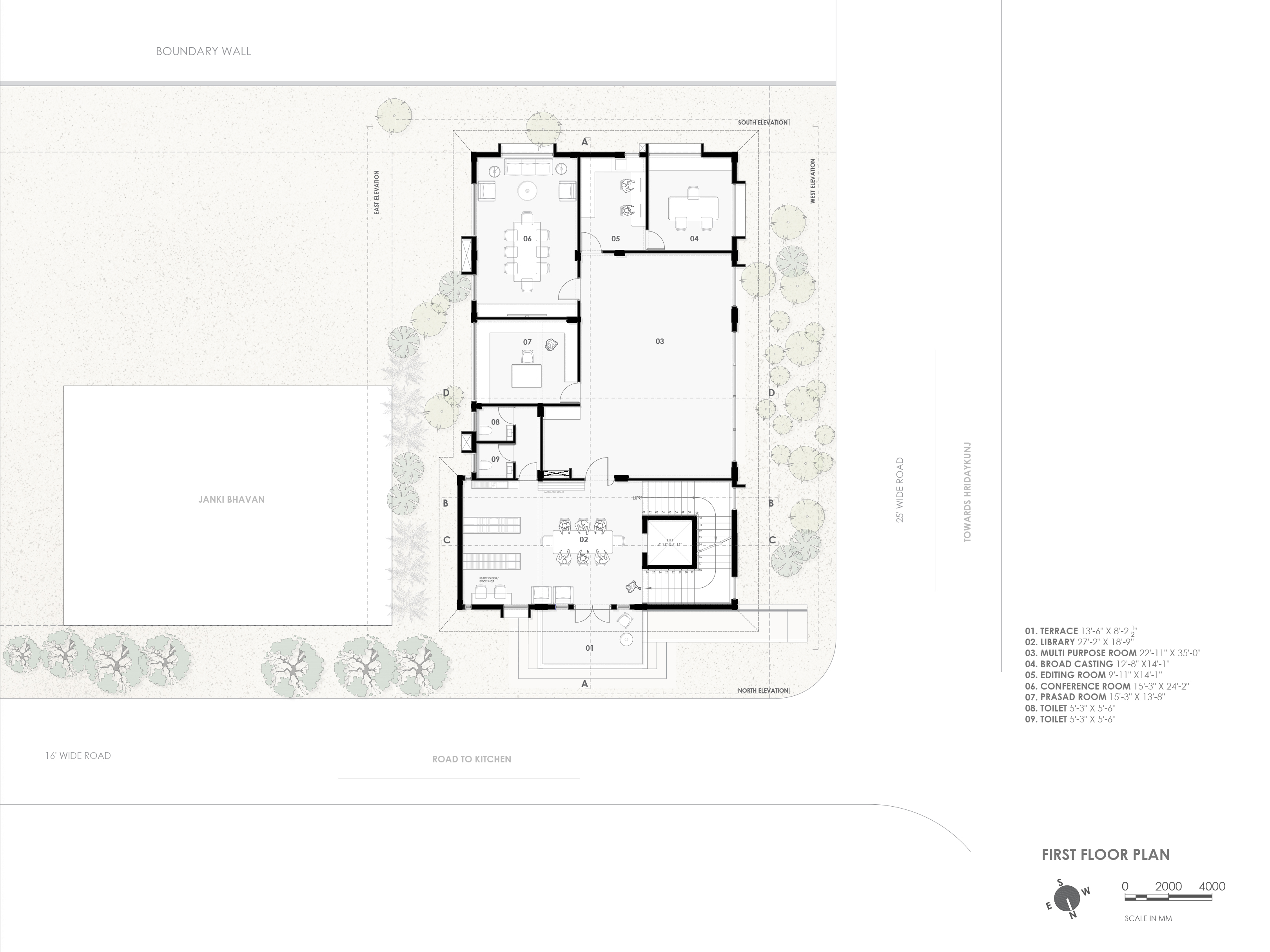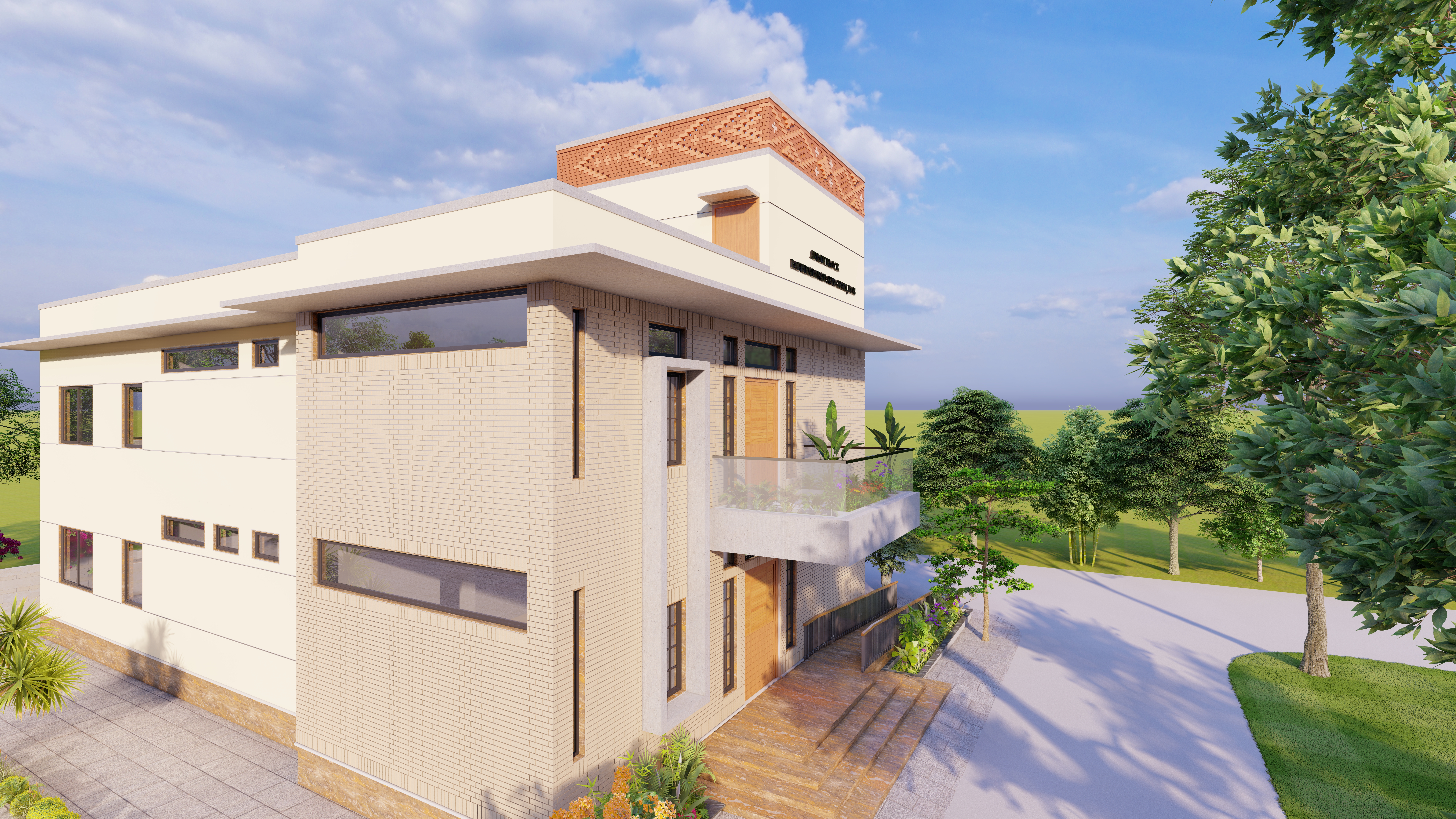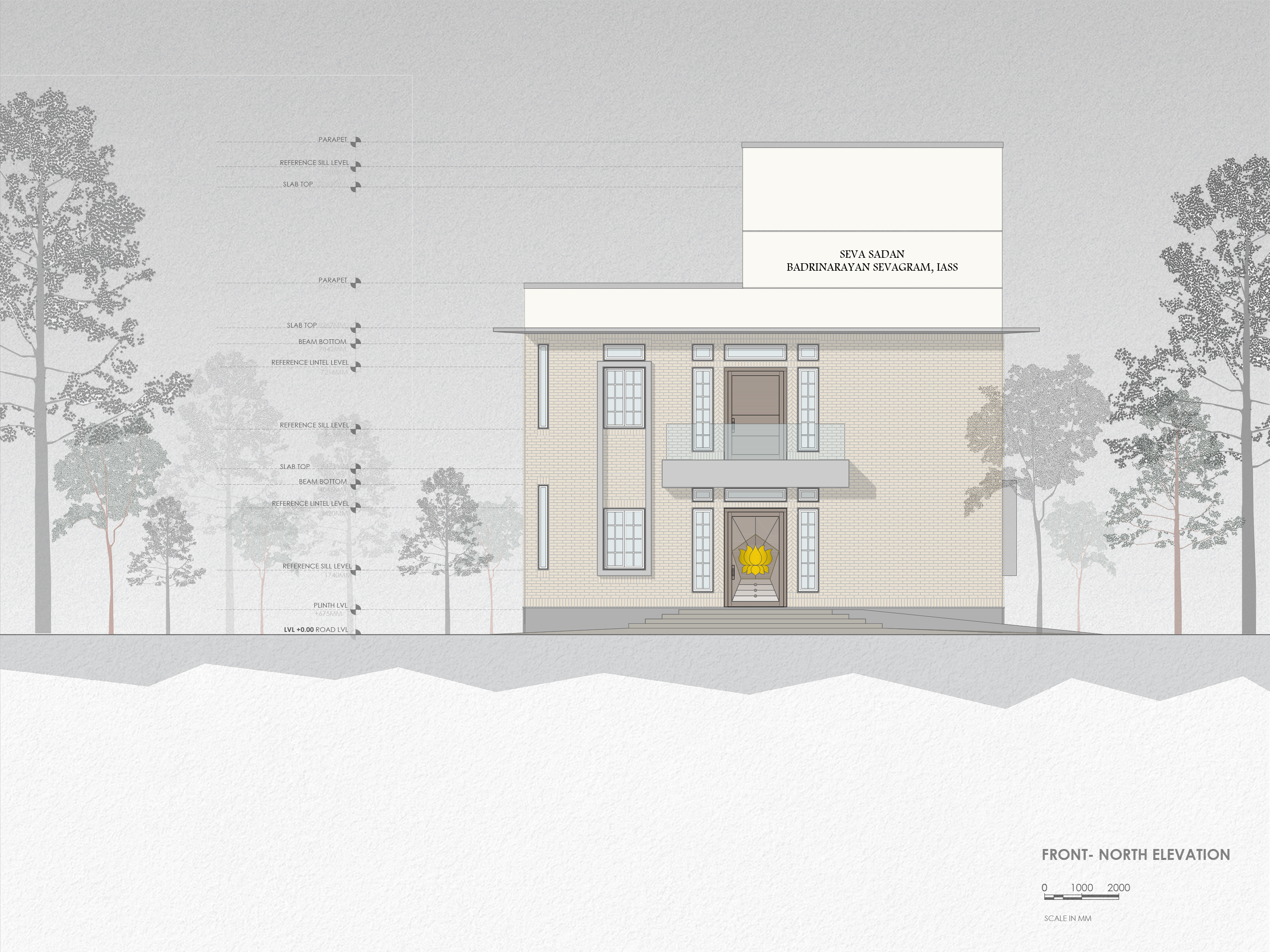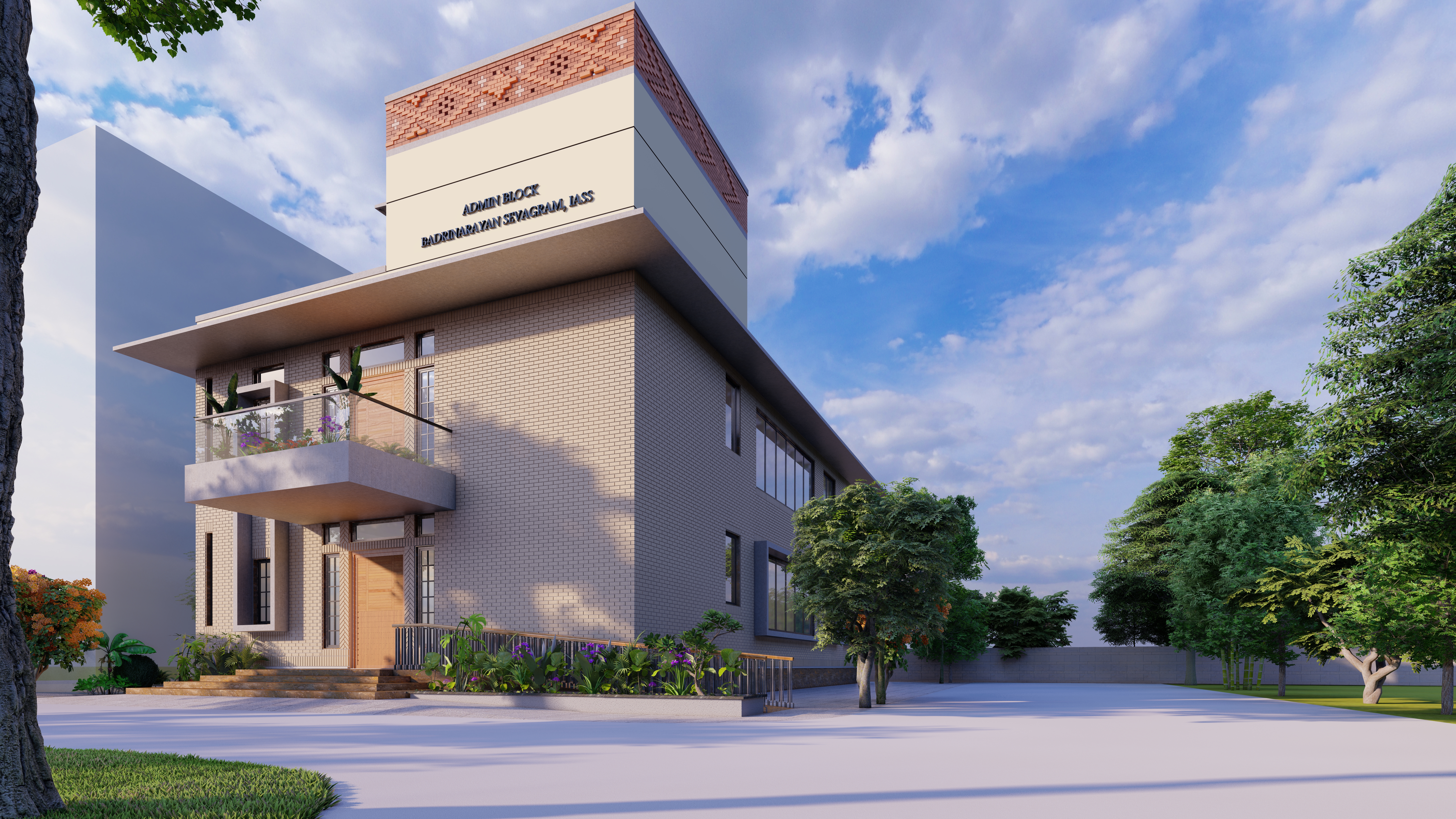 The administrative building is designed as a contemporary institutional landmark for International Association for Scientific Spiritualism, Meerut. The building’s massing is defined by a primary monolithic volume, which is strategically punctured by deep-set windows and cantilevered elements. This interplay of solids and voids creates a rhythmic facade that shifts with the path of the sun, providing natural shading while maintaining a strong street presence.