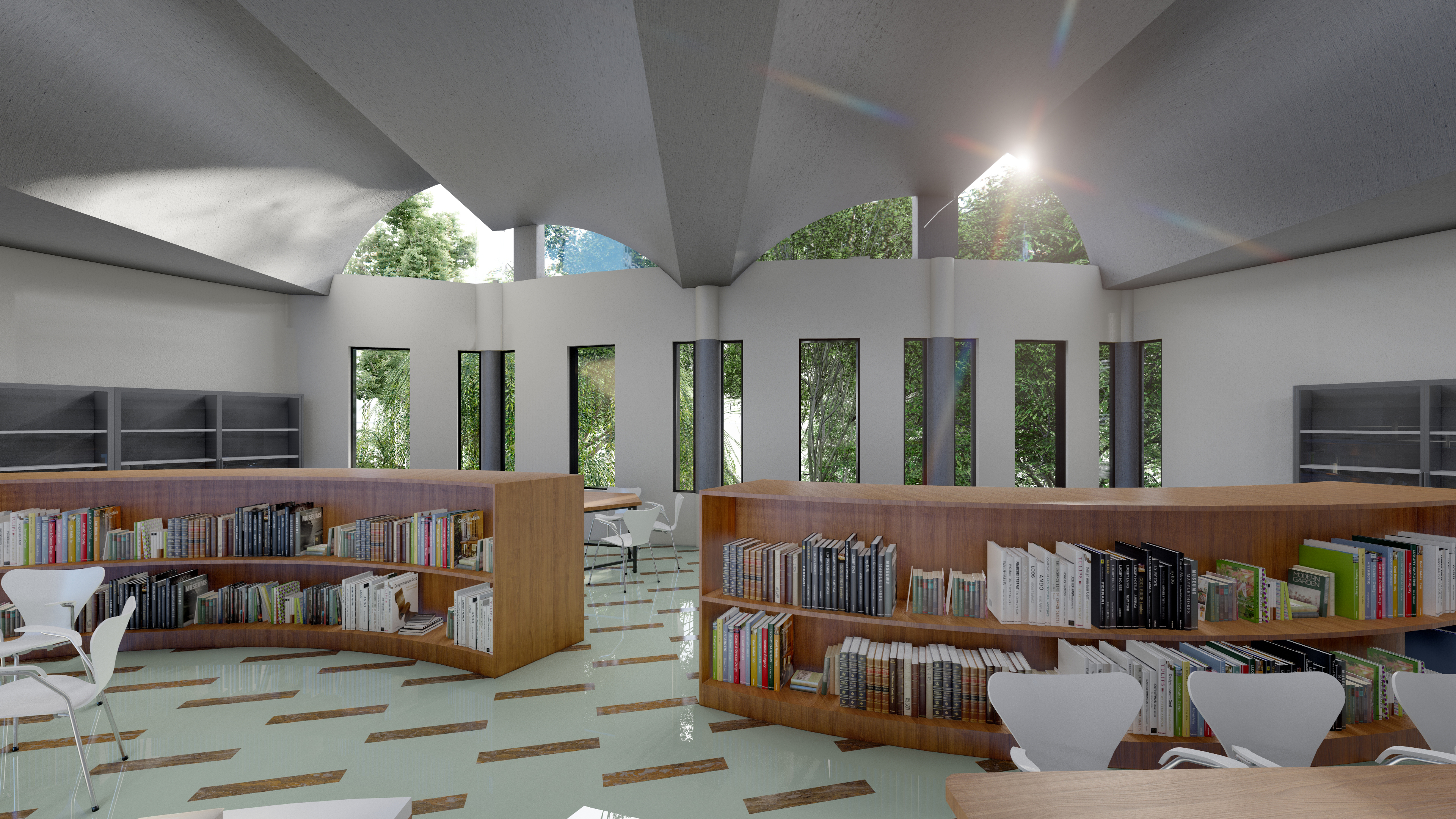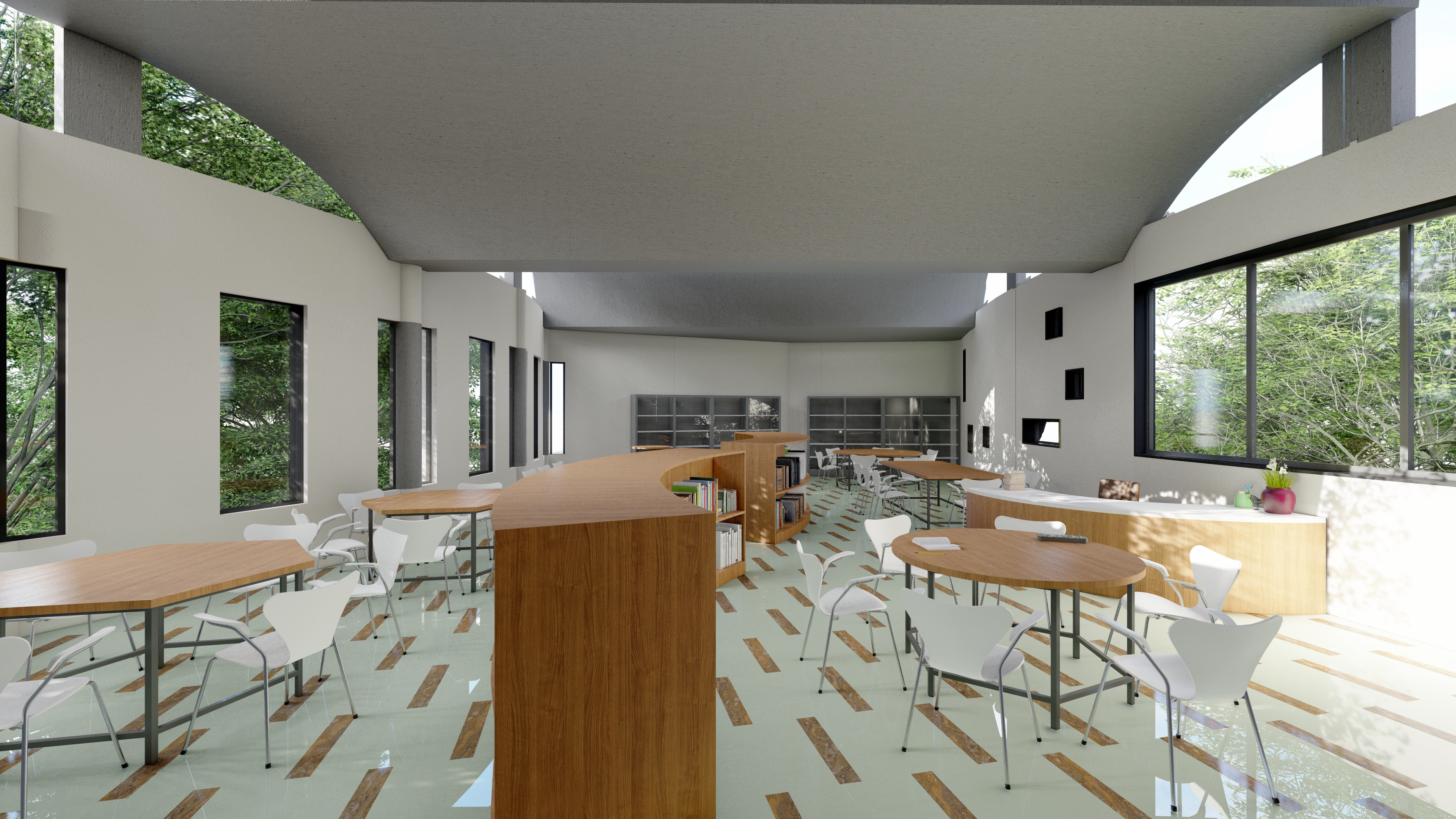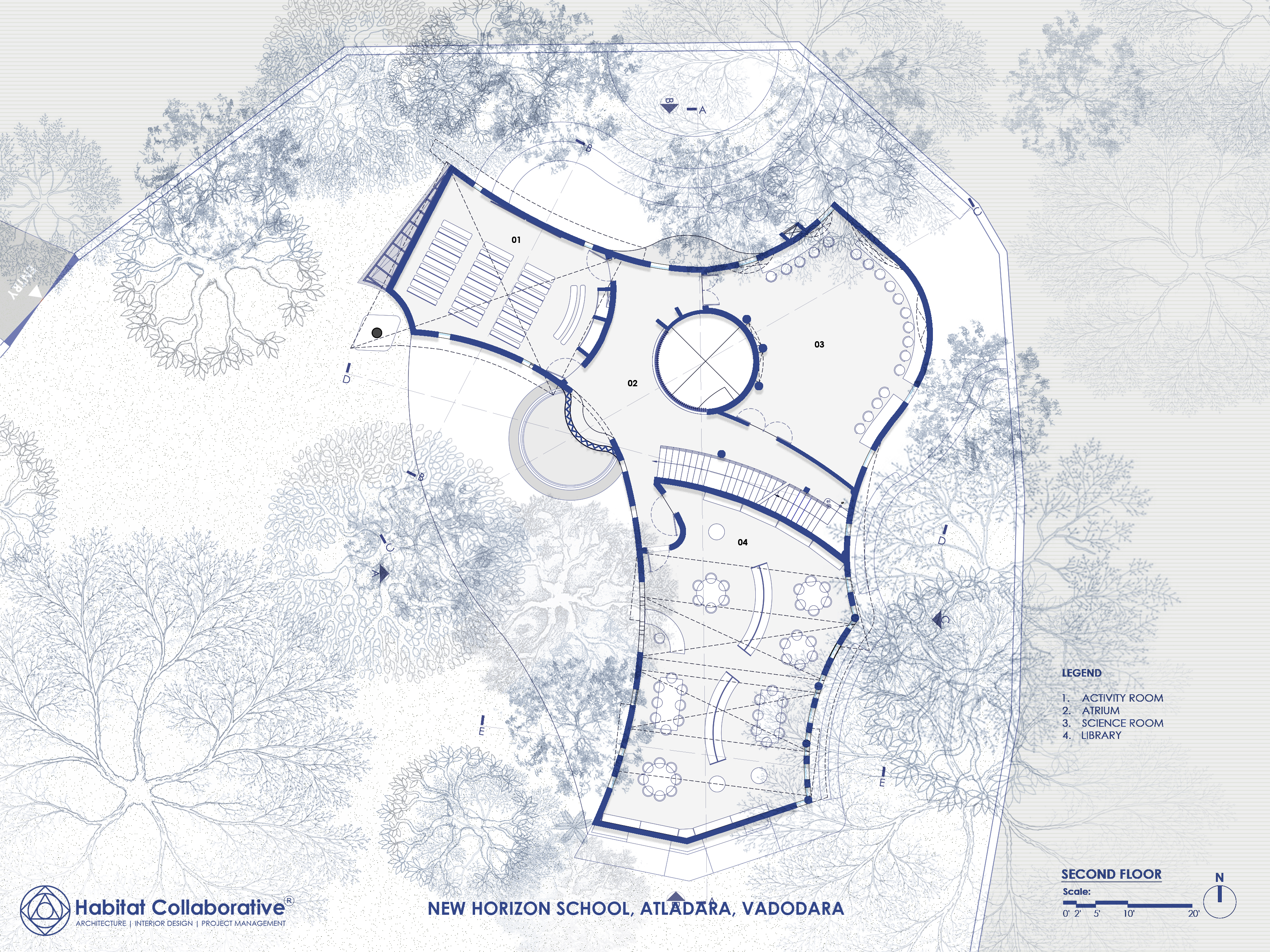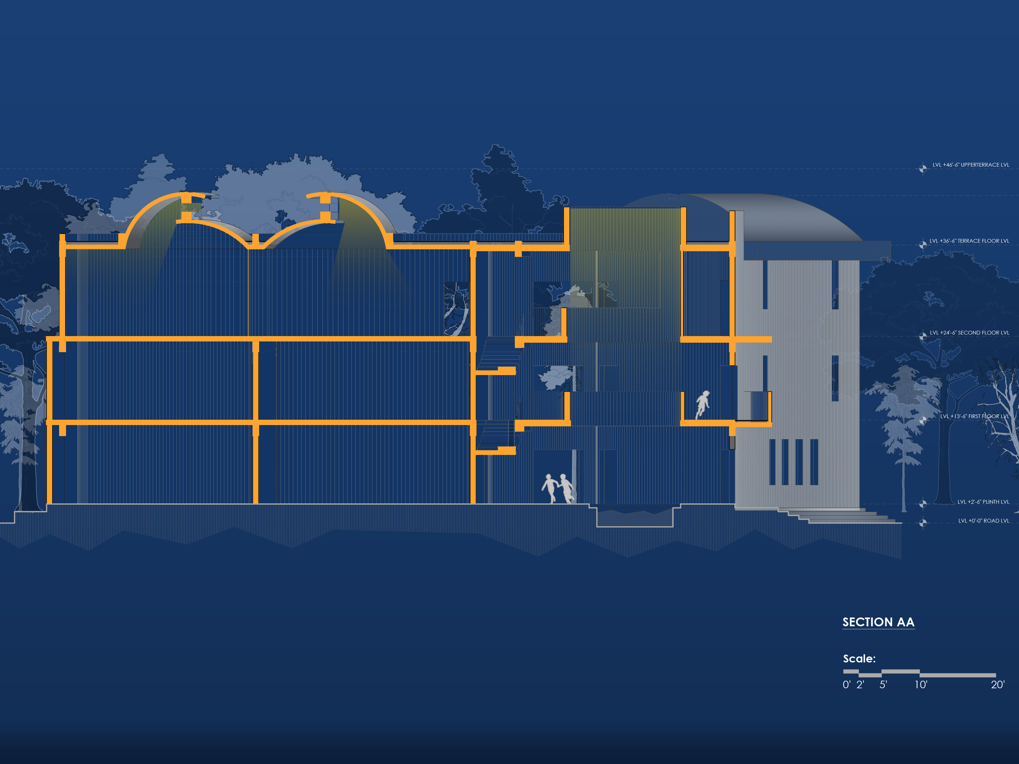 The result? An architecture that gives flight to students’ aspirations and dreams; shaped by more than 35 mature trees surrounding the site. It seems as if the building took the space and form that nature for intended it to take. The first two floors of the building boasts 6 classrooms, including an amphitheatre style classroom, designed to improve visibility even from the last row of seating. Each classroom has unique flooring, informed by feedback received from students during design workshops, giving a unique character to each space. The second floor boasts spaces that heighten experientiality and volume with gravity defying vaulted and double vaulted roofs in the activity room and library, respectively. The science lab has a sense of meditative calm to it, with semicircular skylights flooding the walls with ambient light.