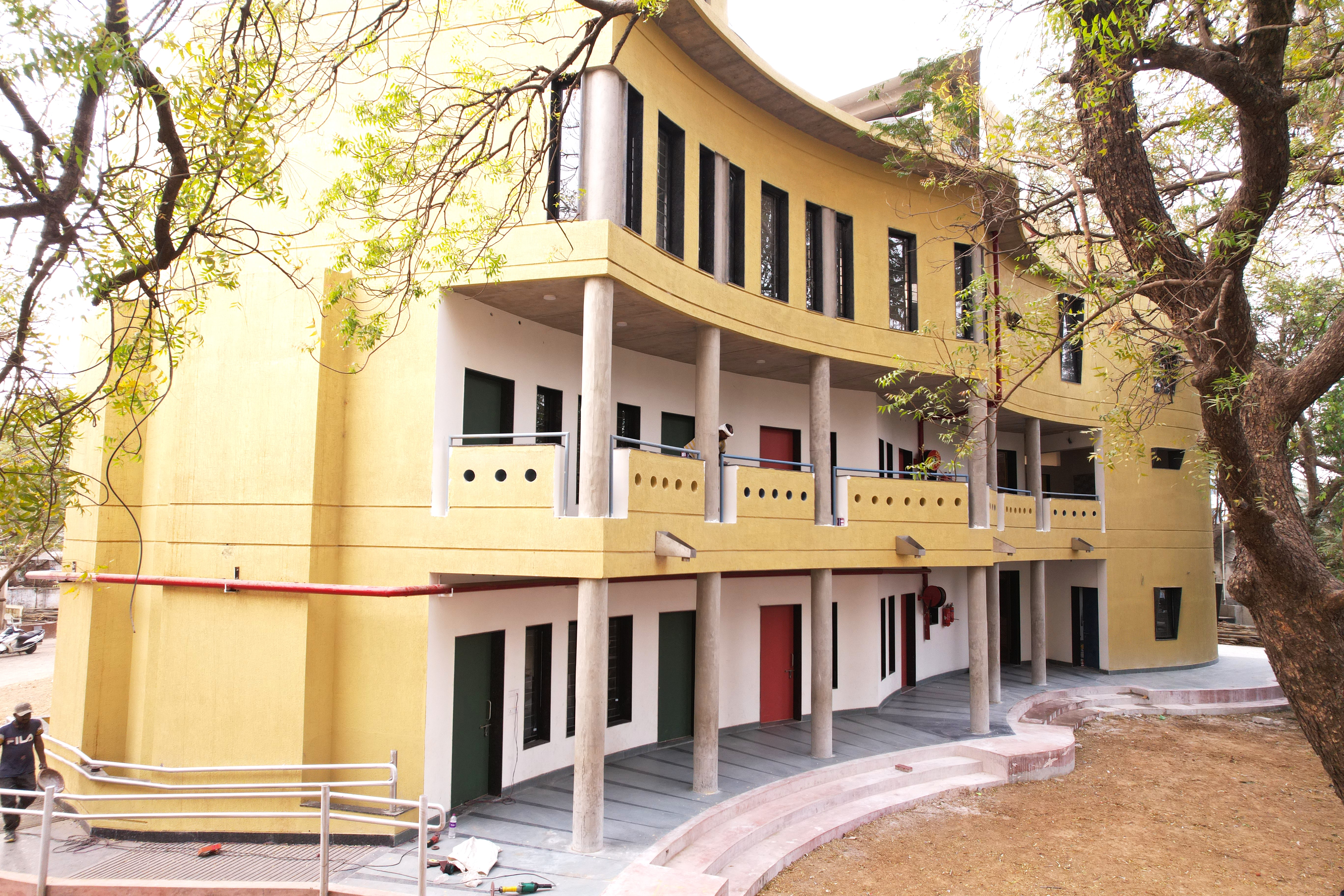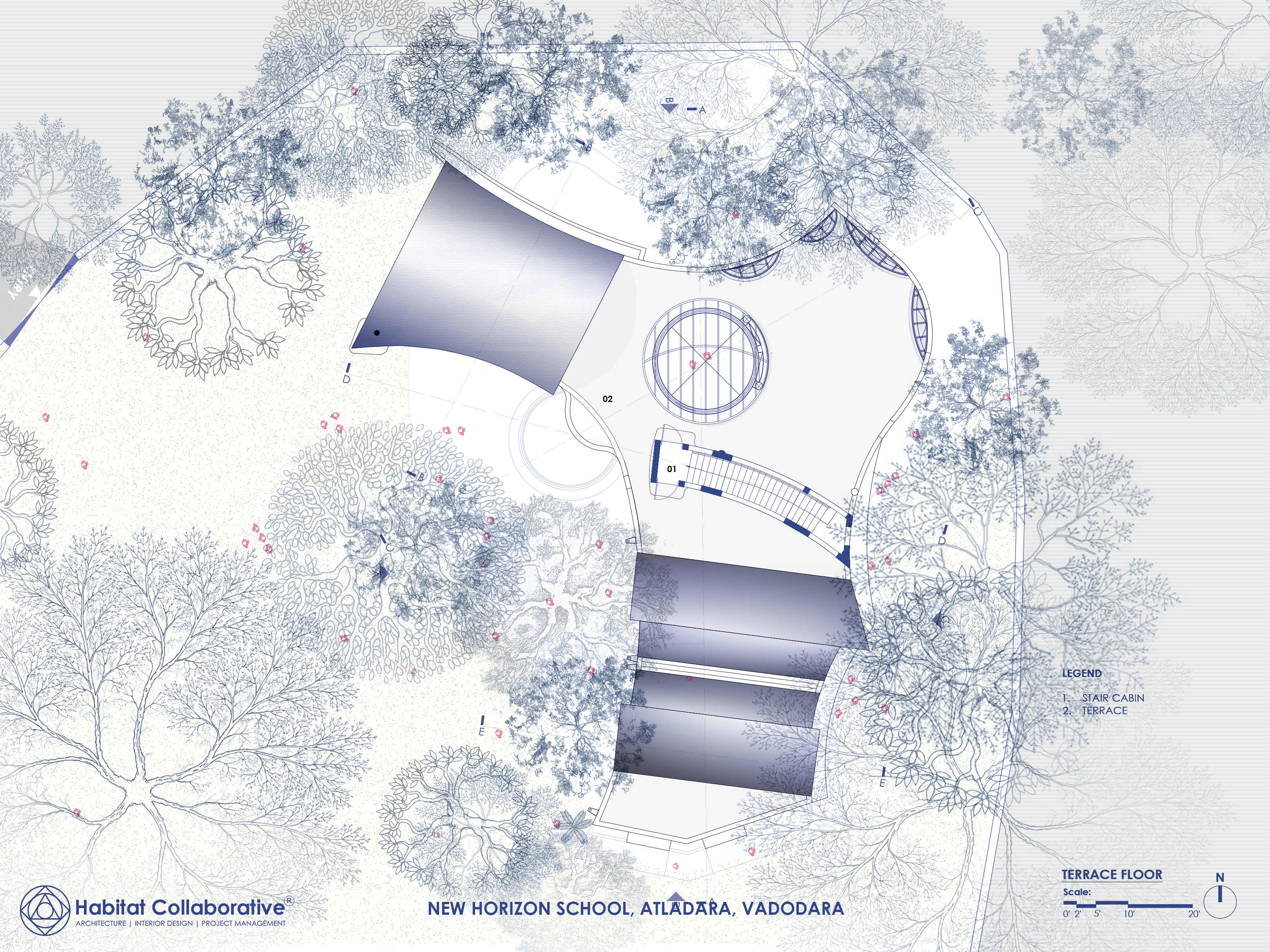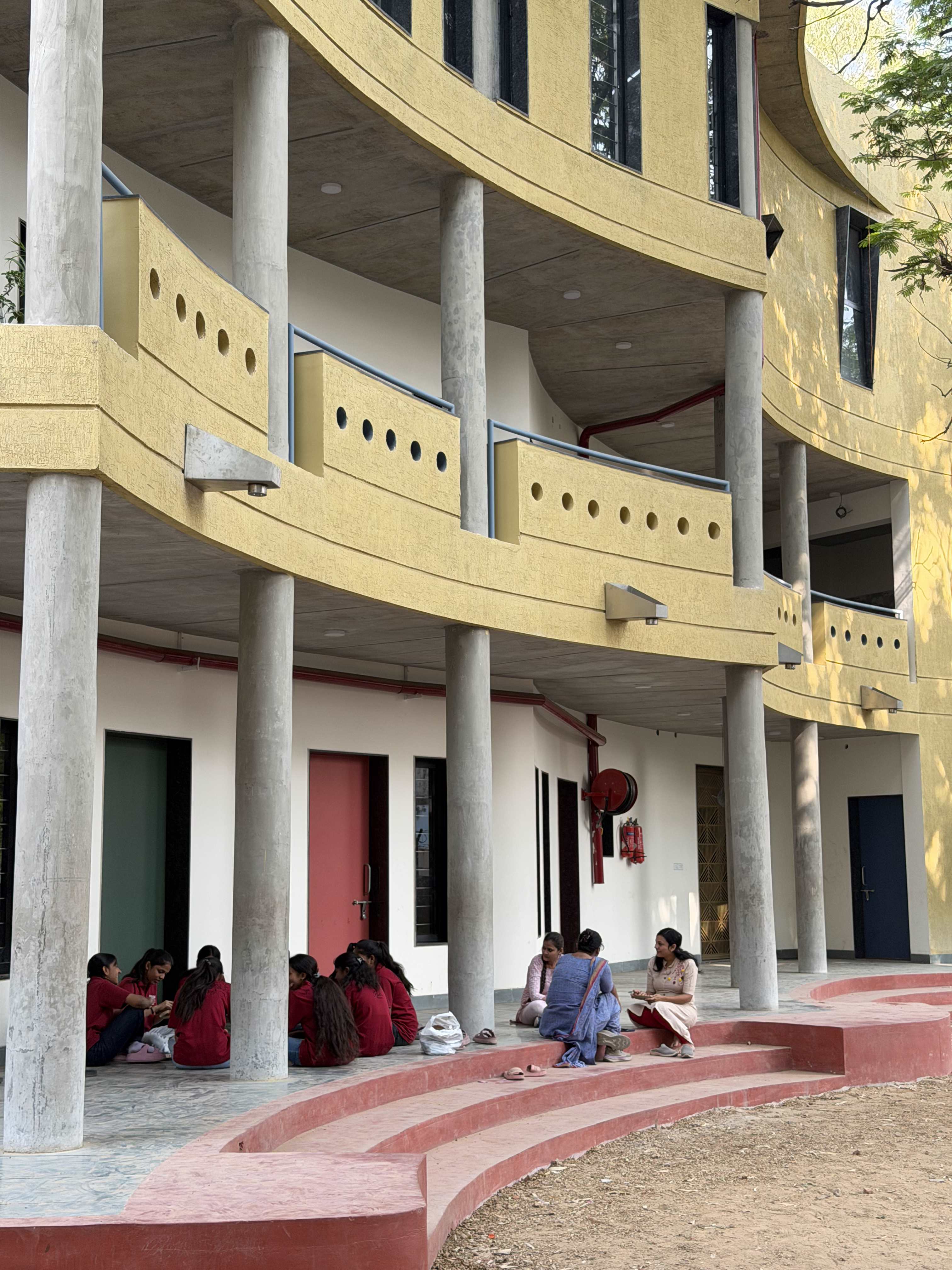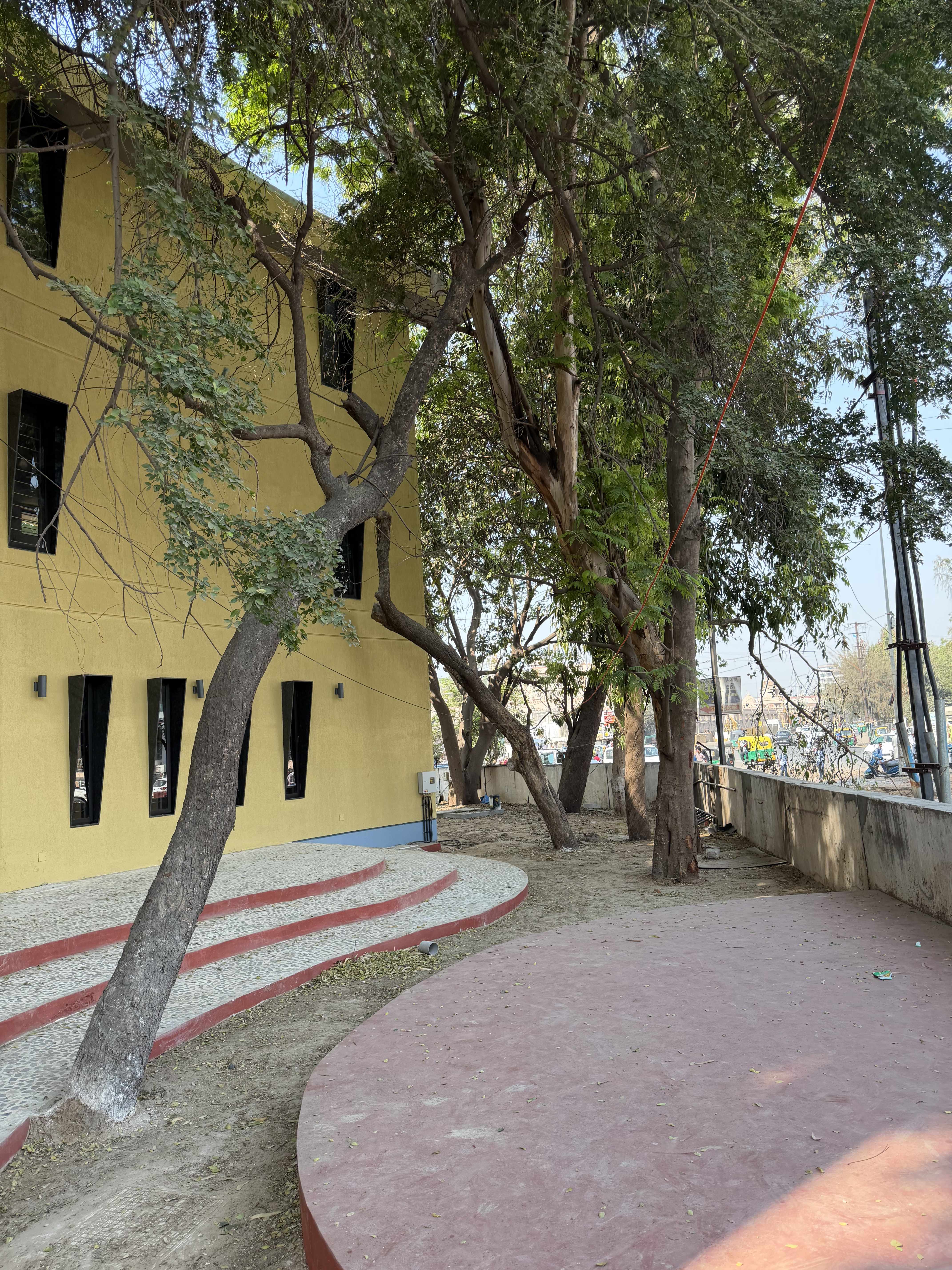 The result? An architecture that gives flight to students’ aspirations and dreams; shaped by more than 35 mature trees surrounding the site. It seems as if the building took the space and form that nature for intended it to take. The first two floors of the building boasts 6 classrooms, including an amphitheatre style classroom, designed to improve visibility even from the last row of seating. Each classroom has unique flooring, informed by feedback received from students during design workshops, giving a unique character to each space. The second floor boasts spaces that heighten experientiality and volume with gravity defying vaulted and double vaulted roofs in the activity room and library, respectively. The science lab has a sense of meditative calm to it, with semicircular skylights flooding the walls with ambient light.