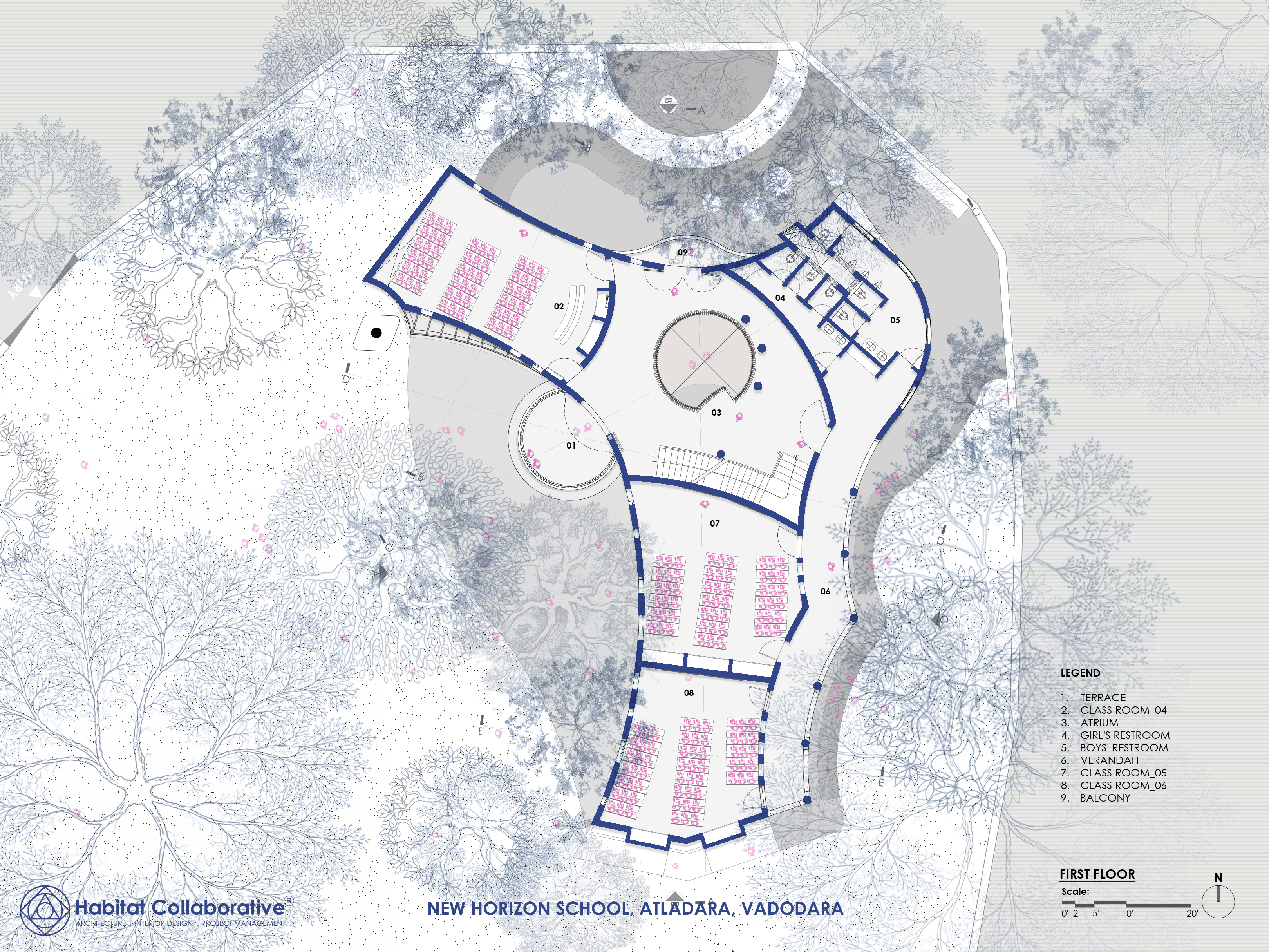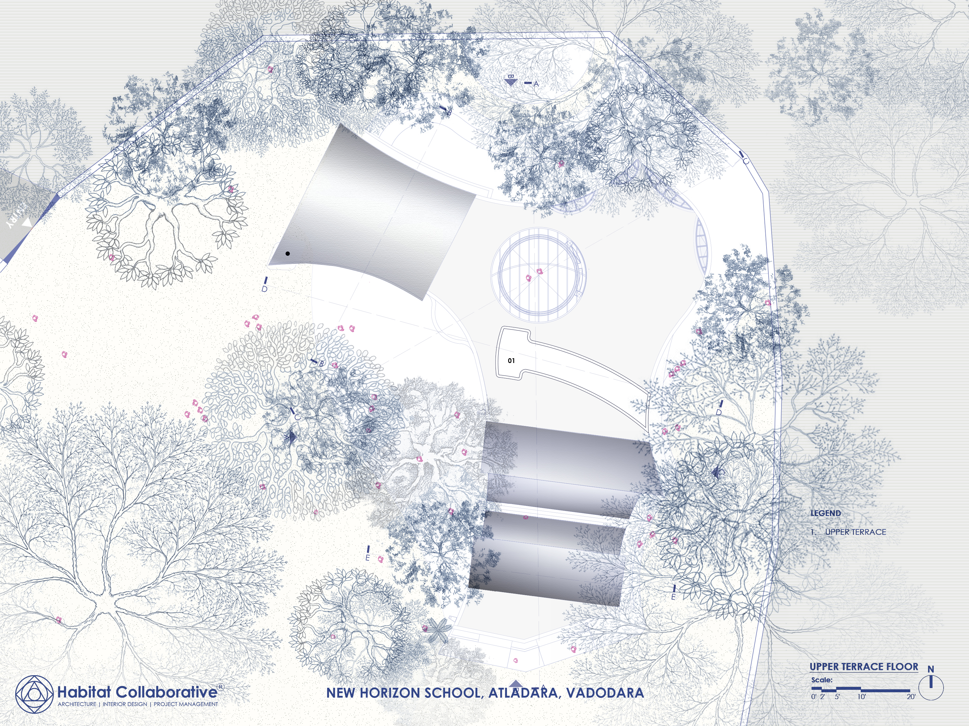 A cantilevered balance cantilever canopy welcomes the student into the building, which has triple heighted atrium at its heart. The atrium fills in the heart of the building with soft light filtered in through a dome shaped skylight. The atrium spaces doubles up as a temperature regulator of the building with provision to let out hot air through venturi effect, which ensures a constant inflow of fresh air into the building. This atrium is also gifted with a sand pit acting as the central pivot around which kids’ play revolves.