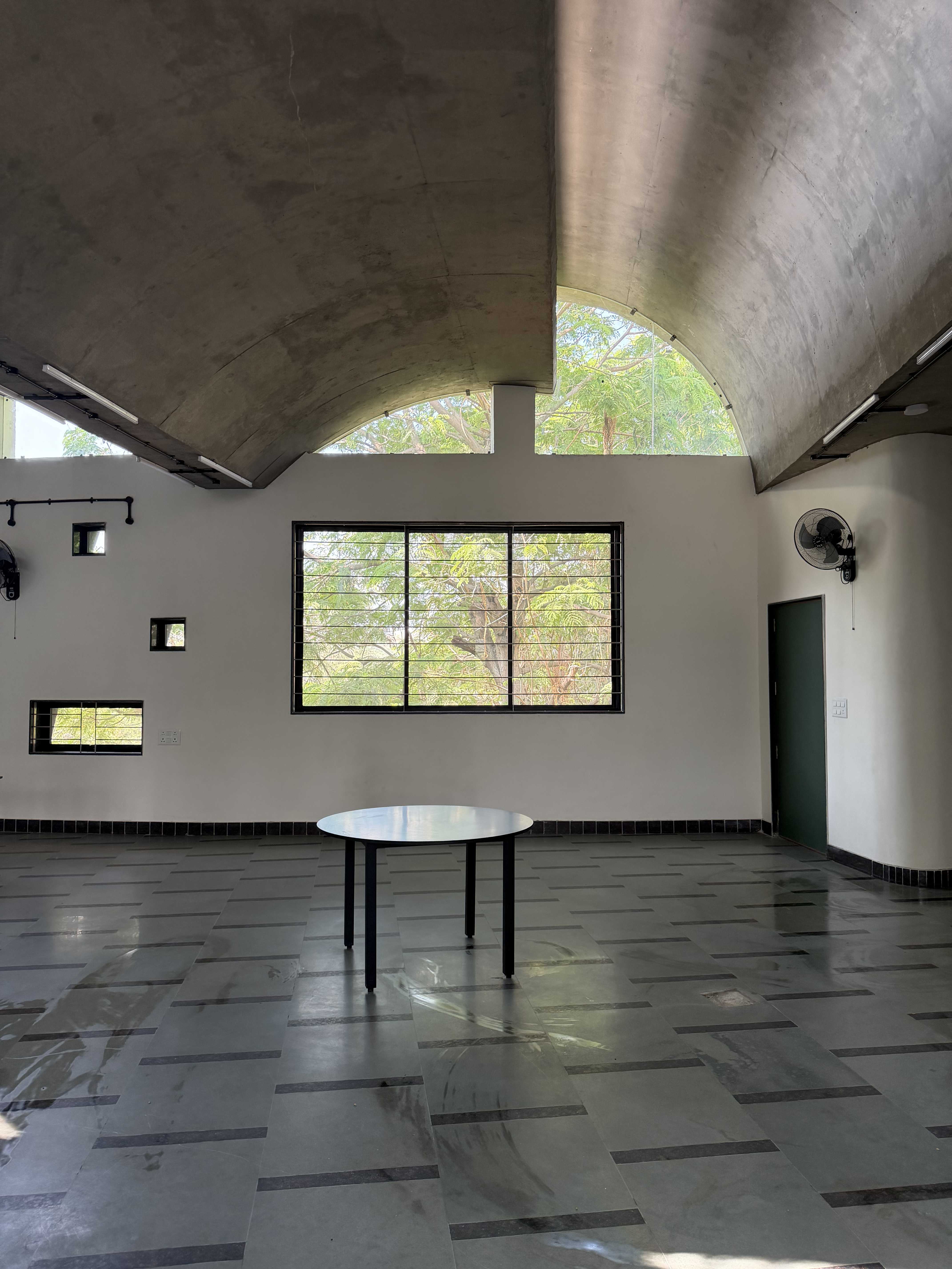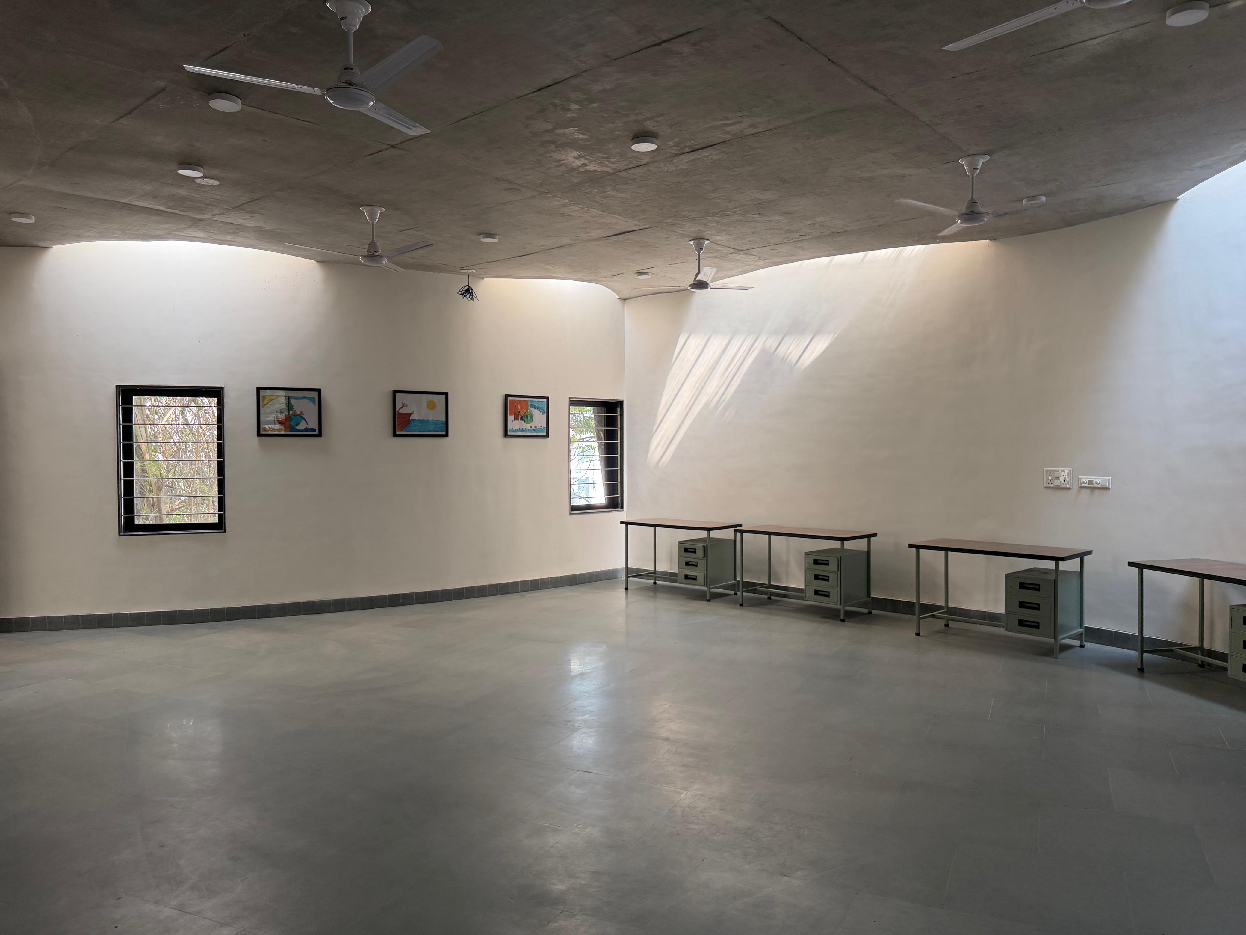 The library space is imagined and built to invigorate an inspiring environment to encourage and inculcate the habit of reading in kids. Two sets of double half vaults overlap to create a horizontal slit window that washes the exposed concrete ceiling with a silvery sheen. Picturesque Vertical slit windows frame views of the trees towards the east and anthropometrically sized windows selectively let in the west sun, minimizing glare and heat gain.